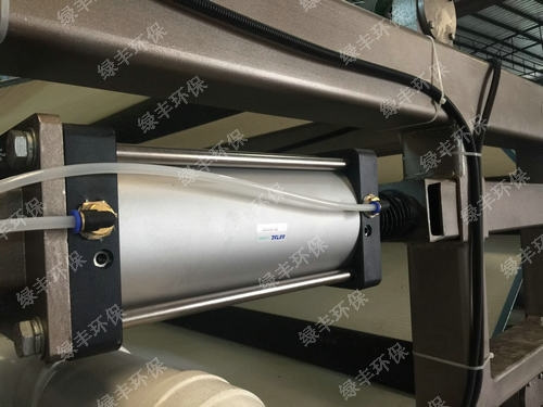 張緊系統(tǒng)的作用是張緊上、下濾帶,通過主傳動輥帶動所有輥子運轉(zhuǎn),并使之向濾餅施加一定的擠壓力和剪切力而脫水,本機采用帶緩沖氣缸張緊,通過調(diào)節(jié)氣壓大小來控制張緊力,保證上下濾網(wǎng)同步運轉(zhuǎn),保證物料在上下濾網(wǎng)間包裹緊密。